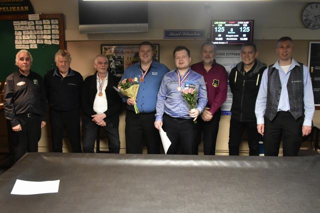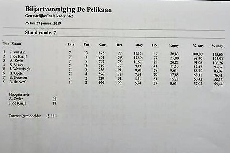 Afgelopen weekend is de gewestelijke finale 3e klas kader 38/2 bij ons gespeeld. Vrijdag stonden Jordy de Kruijf (22.00 moy), Dennis Gorter (14.00) en Jeroen van Alst (11.00) aan de leiding met 2 gewonnen wedstrijden. Zaterdag haakte Dennis af door al zijn 3 partijen te verliezen. Jeroen won zijn 3 partijen en Jordy verloor 1 partij tegen Anton Zwier. Op zondag was al bijna zeker wie naar de Nationale finale zouden gaan, Jeroen en Jordy. Beide spelers wonnen hun eerste partij, dus de finale moest bepalen wie zich kampioen mocht noemen. Jeroen had 12 punt en 11.00 moy en Jordy had 10 punt en 14.00 moy. Jeroen nam al snel een voorsprong maar Jordy kon goed bijblijven. Met nog 1 tegaan miste Jeroen en Jordy tikte de partij beheerst uit. Jeroen moest de nastoot maken en deed dat ook. REMISE in 8 brt. Vermelden waard waren de partijen in 5 brt van Jordy en 6 brt van Jeroen en Anton.