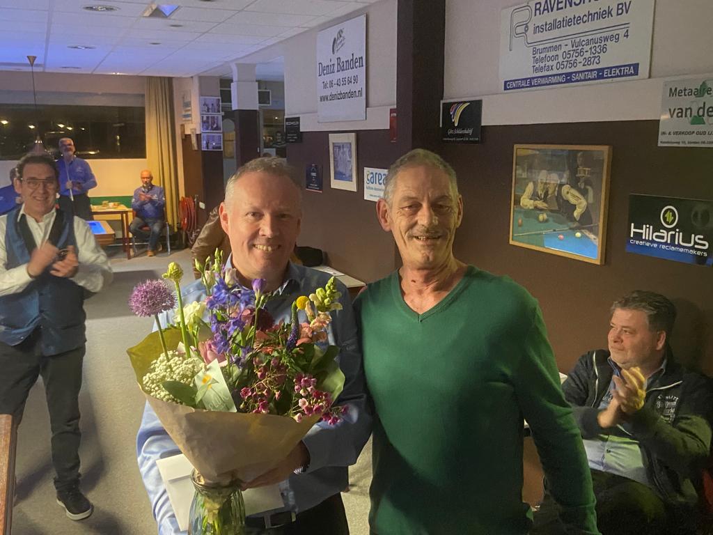 Door het uitvallen van de 2 voorgaande kader wedstrijden is het gisteren gelukt om Michel te huldigen namens de hele vereniging met zijn inmiddels 2 Nationale titels (NK ankerkader 71/2 en NK bandstoten).