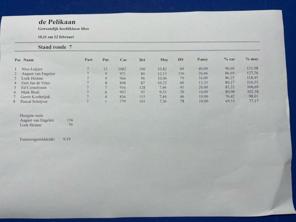 Afgelopen weekend werd bij de Pelikaan de gewestelijke finale hoofdklasse libre gespeeld. Nico Leijzer van harte gefeliciteerd met de 1e plaats en succes in de landelijke finale. Uiteraard ook de felicitaties voor de nummer 2 en 3, August van Engelen en Loek Heinne met hun podiumplaatsen.