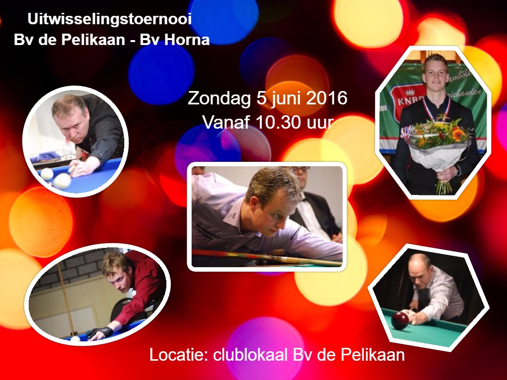 Op zondag 5 juni spelen 15 biljarters van de Pelikaan een uitwisselingswedstrijd tegen?bv Horna uit Hoorn. Locatie: ons clublokaal aan de Troelstralaan.