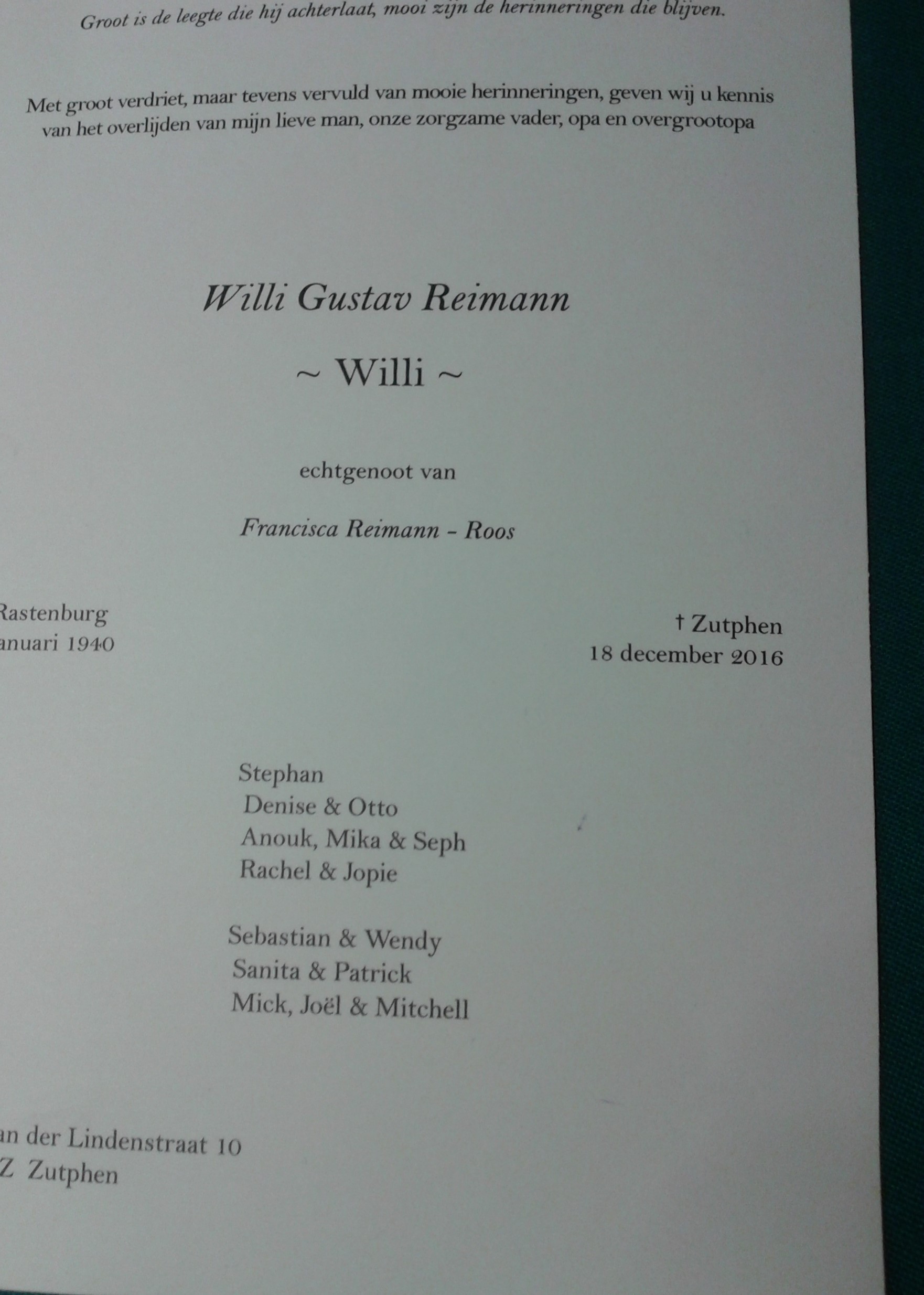 Willy Reimann Geplaatst op 18-12-2016Geüpdatet op 09-01-2017door René PaapCategorieën:Nieuws Zaterdag nacht is Willi Reimann overleden. Willy was een graag geziene gast in onze vereniging. De nieuwe Pelikaan is onder zijn leiding en vakmanschap geworden wat het nu is. Vorig jaar nog de trotse kampioen. Willy we zullen je missen. René Paap